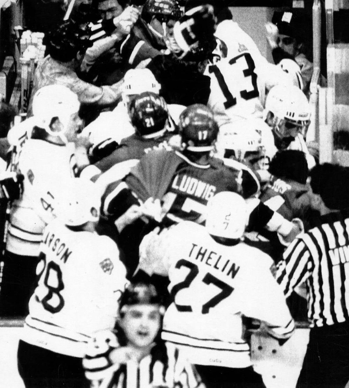 Ambos os bancos vieram em direção a confusão, enquanto alguns jogadores brigavam nos corredores em direção aos vestiários, alguns se atracavam no gelo e as zebras não sabiam pra onde ir! (haha) Assim, Claude Lemieux e Nevin Markwart seguiram “dançando” no gelo por um longo período até finalmente serem apartados por um dos árbitros.