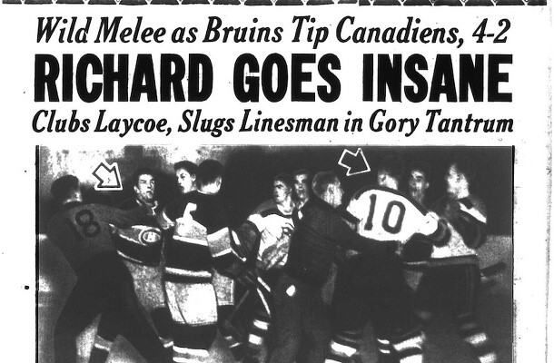No dia 13 de março, Canadiens e Bruins se enfrentavam como de costume, desta vez em Boston. O defensor dos Bruins, Hal Laycoe, acertou Maurice Richard com um high-sticking, abrindo um corte que depois precisaria de cinco pontos na cabeça do jogador dos Habs. A jogada seguiu, já que o time canadense estava em posse do disco. Ao fim da jogada, Richard foi direto na direção de Laycoe, que neste ponto já havia dropado as luvas e o stick, e acertou o jogador dos Bruins com o stick no rosto e nos ombros. Neste momento, os juízes avançaram para Richard, que se livrou dos mesmos e continuou atacando Laycoe até quebrar o stick no adversário e então entrou em cena o árbitro Cliff Thompson e o caldo entornou de vez: o árbitro conseguiu conter Richard a princípio, porém o jogador dos Habs se desvencilhou da zebra e desferiu dois socos violentos contra Thompson, que caiu nocauteado no gelo. Richard saiu do gelo acompanhado de um dos técnicos dos Habs, recebeu uma multa automática de 100 dólares e uma penalidade que o tirou do jogo (match penalty) e Laycoe recebeu um major e uma penalidade por má conduta de 10 minutos.