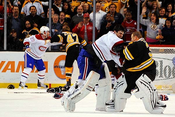 Faltando 9 minutos e meio, PK Subban por pouco não arranca a cabeça de Brad Marchand com um hit alto, o camisa 63 retaliou poucos minutos depois com um hit nas bordas em Ryan O’Byrne e aí o tempo fechou pra valer! Basicamente todos os jogadores no gelo se atracaram em brigas e troca de empurrões. Zdeno Chara veio disparado em direção a Max Pacioretty, que um mês antes havia marcado um gol e provocado o defensor dos Bruins com um empurrão (GUARDEM BEM ESSA INFORMAÇÃO). Enquanto as zebras tentavam separar os jogadores de linha, os goleiros Tim Thomas e Carey Price começaram uma acalorada discussão e então, em um raro momento nos dias de hoje, tivemos uma briga entre goleiros.